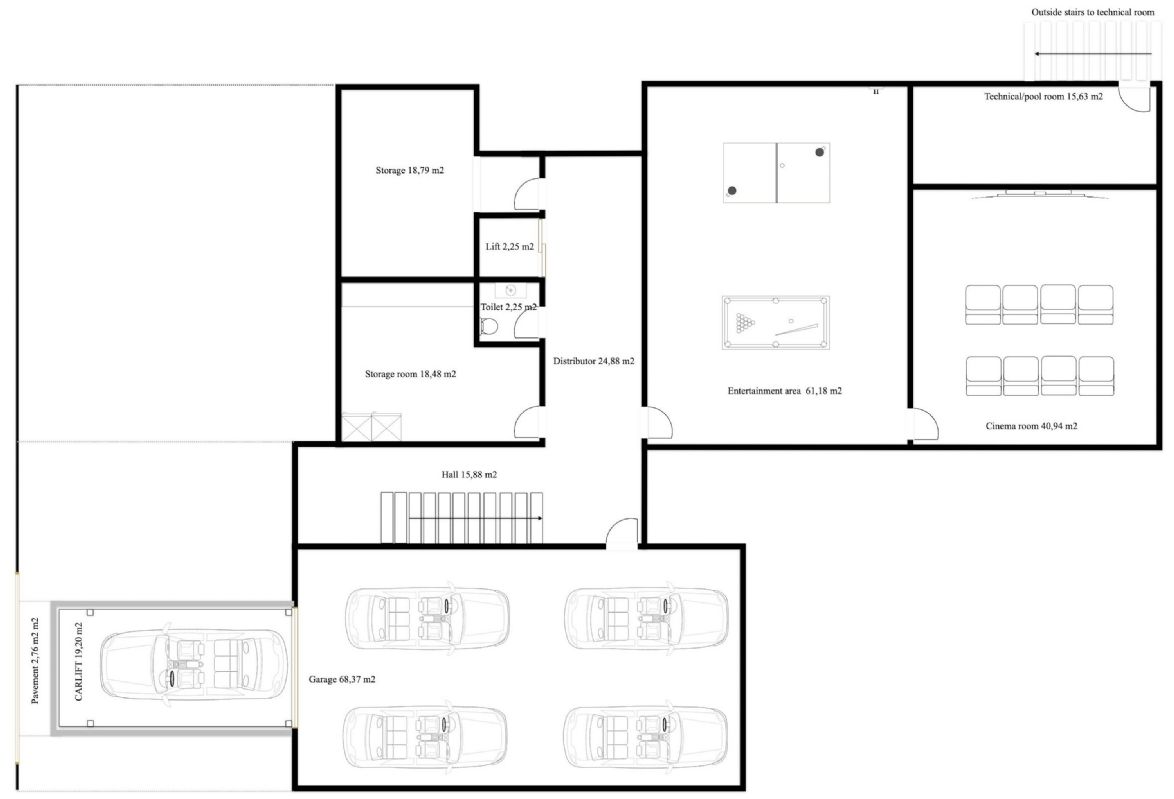 Desde la planta baja y la primera planta, tiene acceso a través del ascensor o la escalera al sótano con un garaje para 4 coches accesible a través de un ascensor de coches, 2 trasteros enormes, un aseo de invitados, una sala técnica y una sala de juegos / cine.