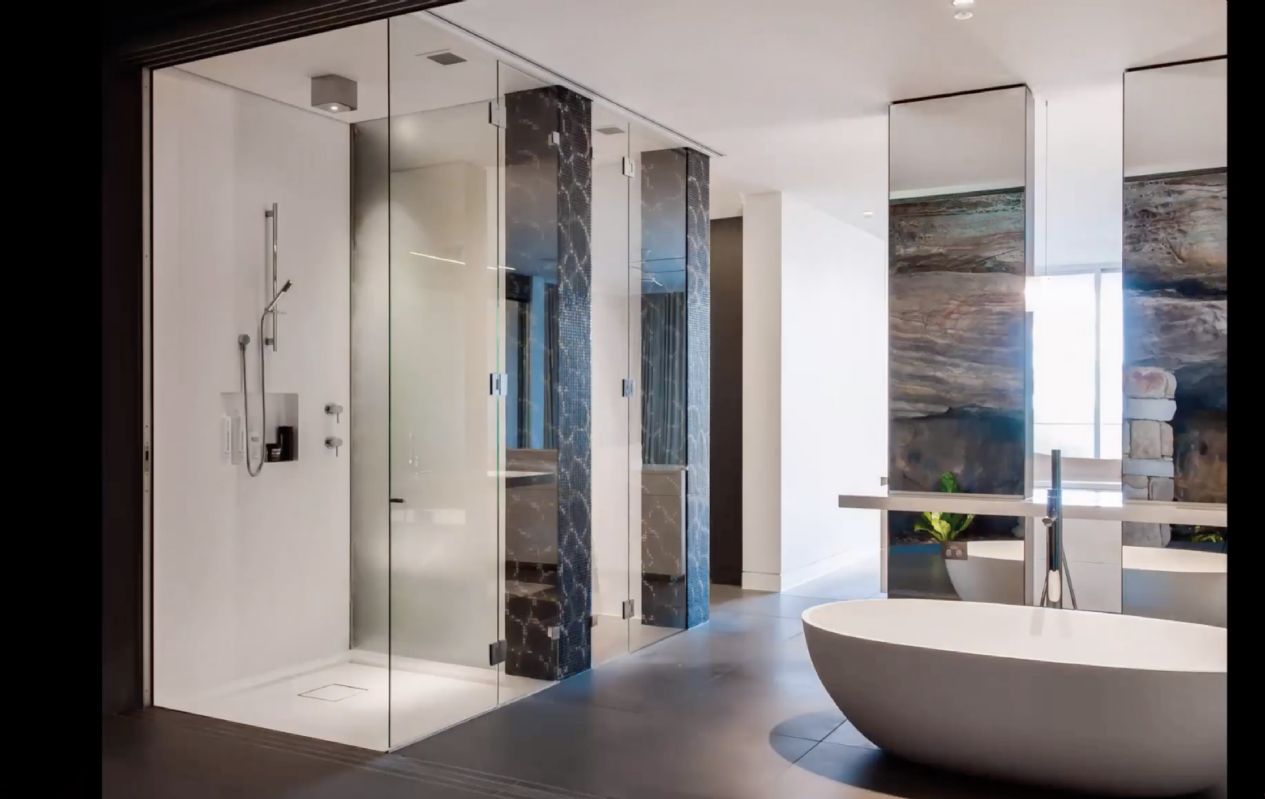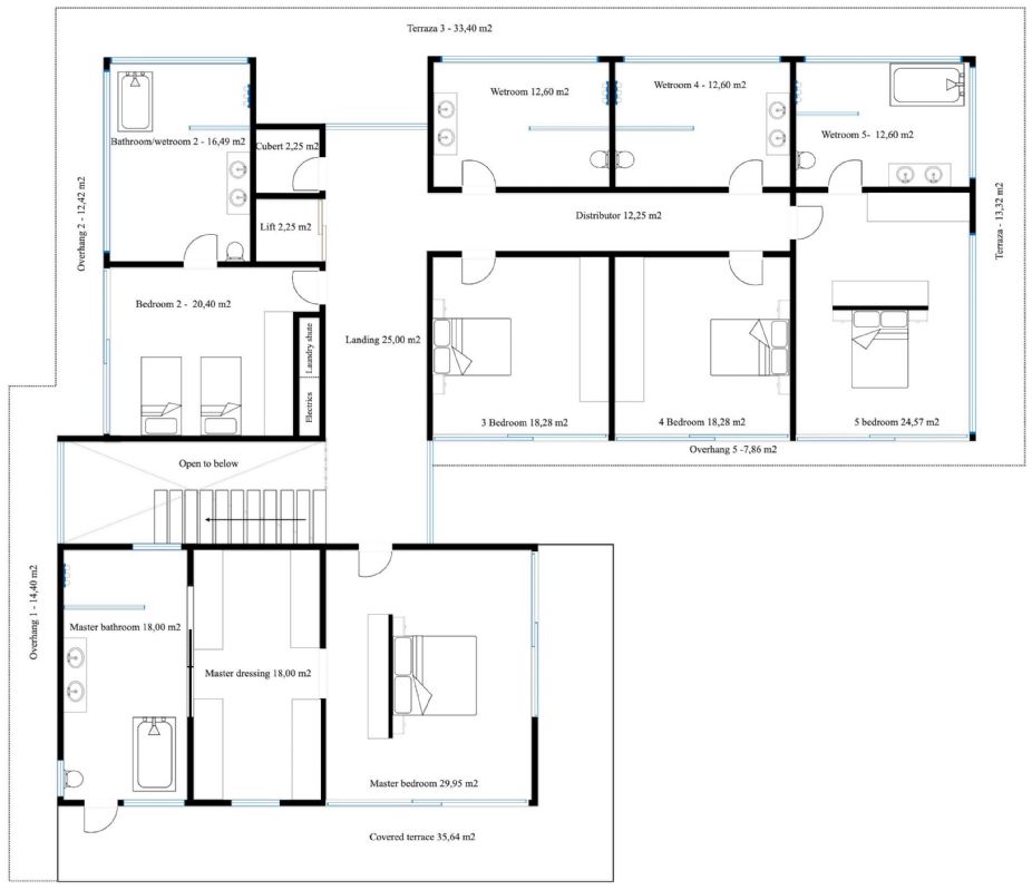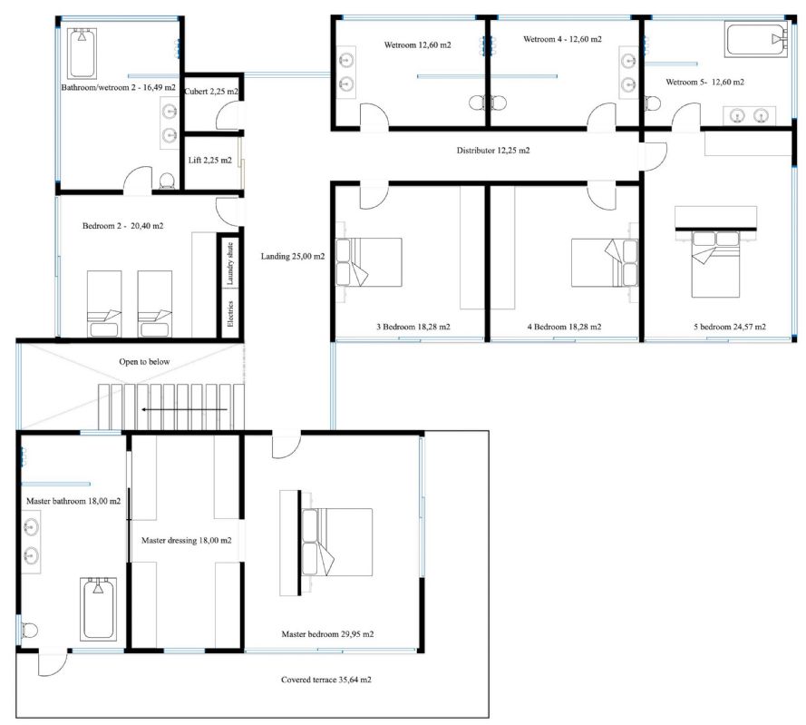 La escalera o el ascensor le llevan a la primera planta donde encontramos el gran dormitorio principal con vestidor, armario tras la pared del dormitorio, baño ensuite y terraza privada. En el otro lado de esta planta, tiene el ascensor, un pequeño trastero, y la rampa de lavandería para que no tenga que arrastrar la colada escaleras abajo. Además, aquí tienes otros 2 dormitorios con baño ensuite y 2 dormitorios con 2 baños. Cada cuarto de baño tiene una pequeña terraza que da acceso a jardineras.