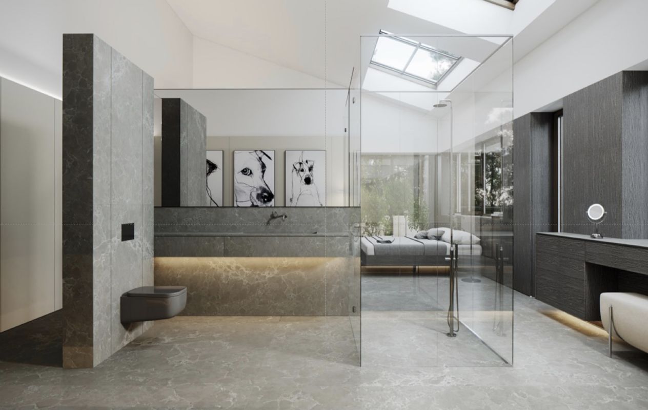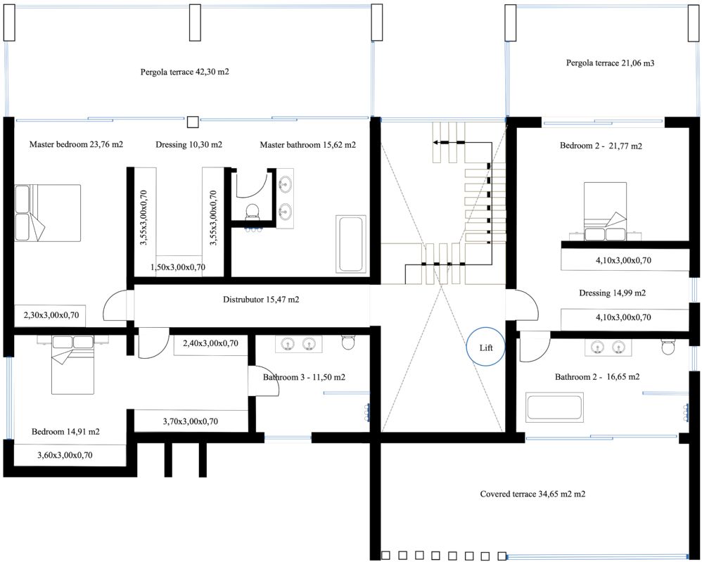 Primera planta: Dormitorio principal con baño en suite con un gran vestidor y 2 terrazas privadas En esta planta, tenemos también otros 2 dormitorios con baño en suite y vestidor. Uno de los dormitorios tiene acceso a la terraza.