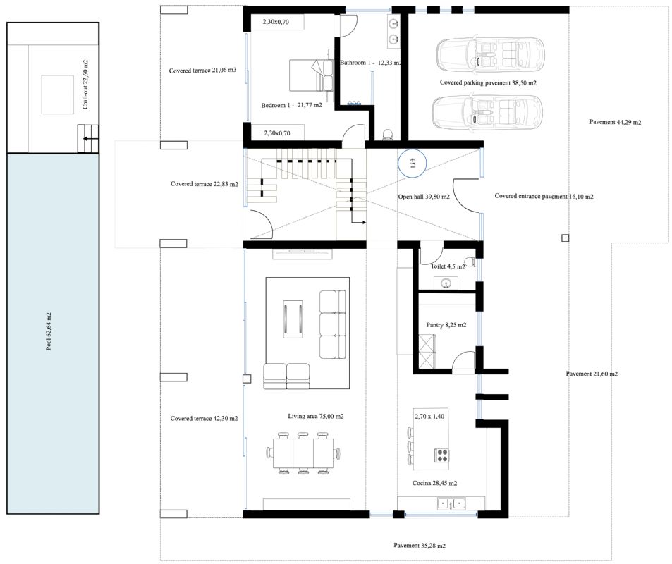 Planta baja: hall de doble altura con escalera, y aseo de invitados, un gran salón/comedor que da a la gran terraza con piscina y zona chill-out, cocina totalmente equipada con despensa. También hay un dormitorio con baño en suite en la planta baja.
