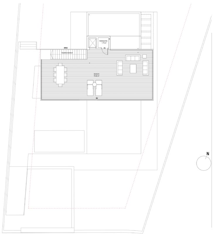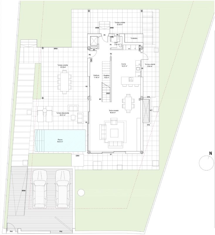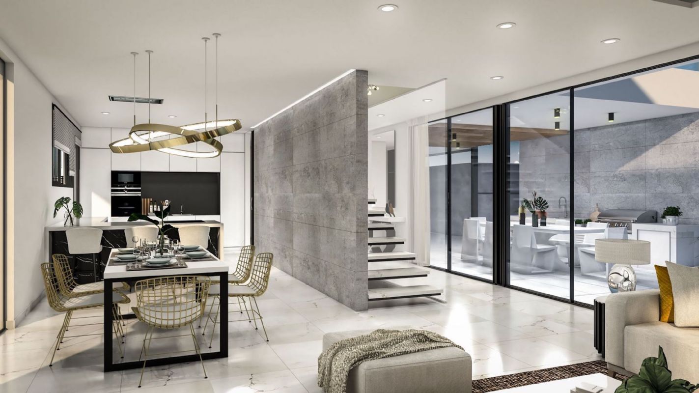 Planta baja; Entrada/aparcamiento, hall de entrada con aseo de invitados, ascensor y escalera gran salón/comedor abierto con cocina totalmente equipada. El salón y la cocina dan a las terrazas cubiertas y descubiertas, piscina, chill-out y jardín.