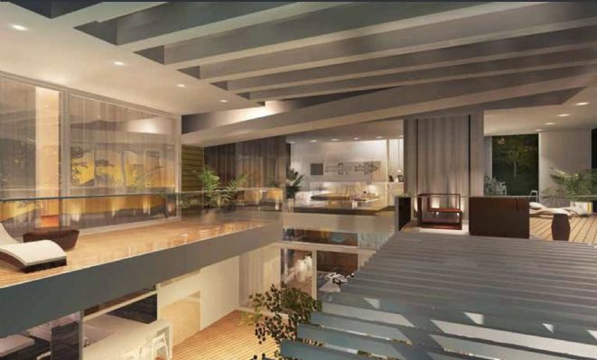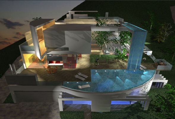 Begane grond: hal met lift en trap, gastentoilet, woonkamer, eetkamer met open keuken, tweepersoonsslaapkamer met badkamer ensuite en dressing. Grote terrassen met zithoeken en een overloopzwembad.