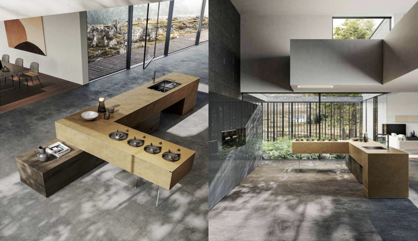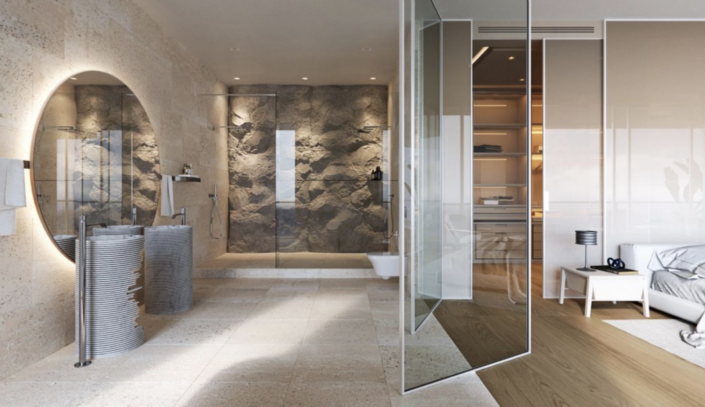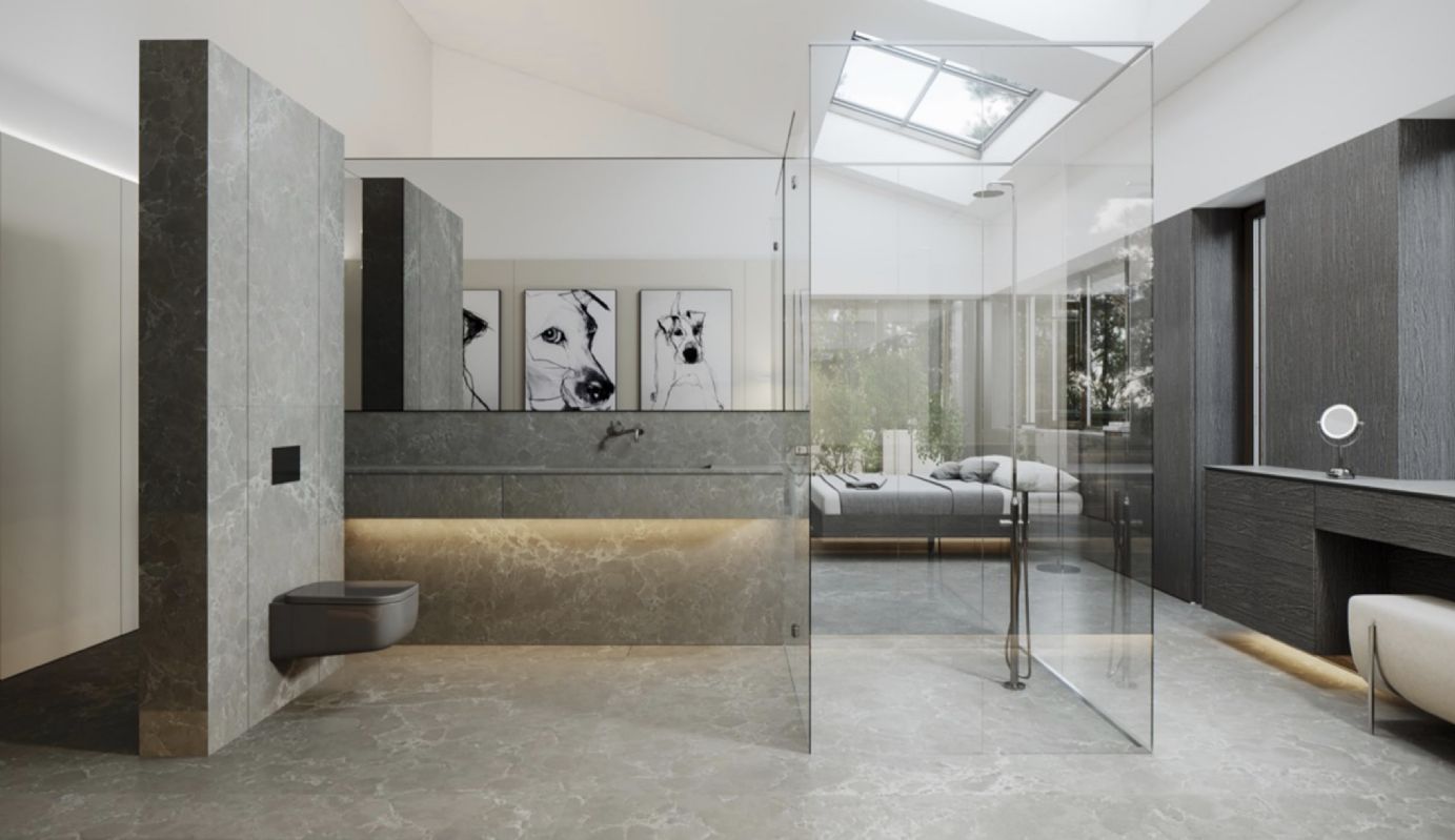 Binnen- en buitenvloeren en badkamer muren van SALONI, buitendraaiende deur van Porteline plafondhoog en 1,50 breed, onzichtbare binnendeuren plafondhoog en 1,00 m breed, apparaten van BOSCH.