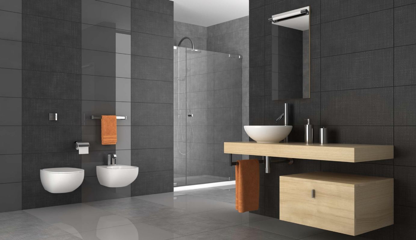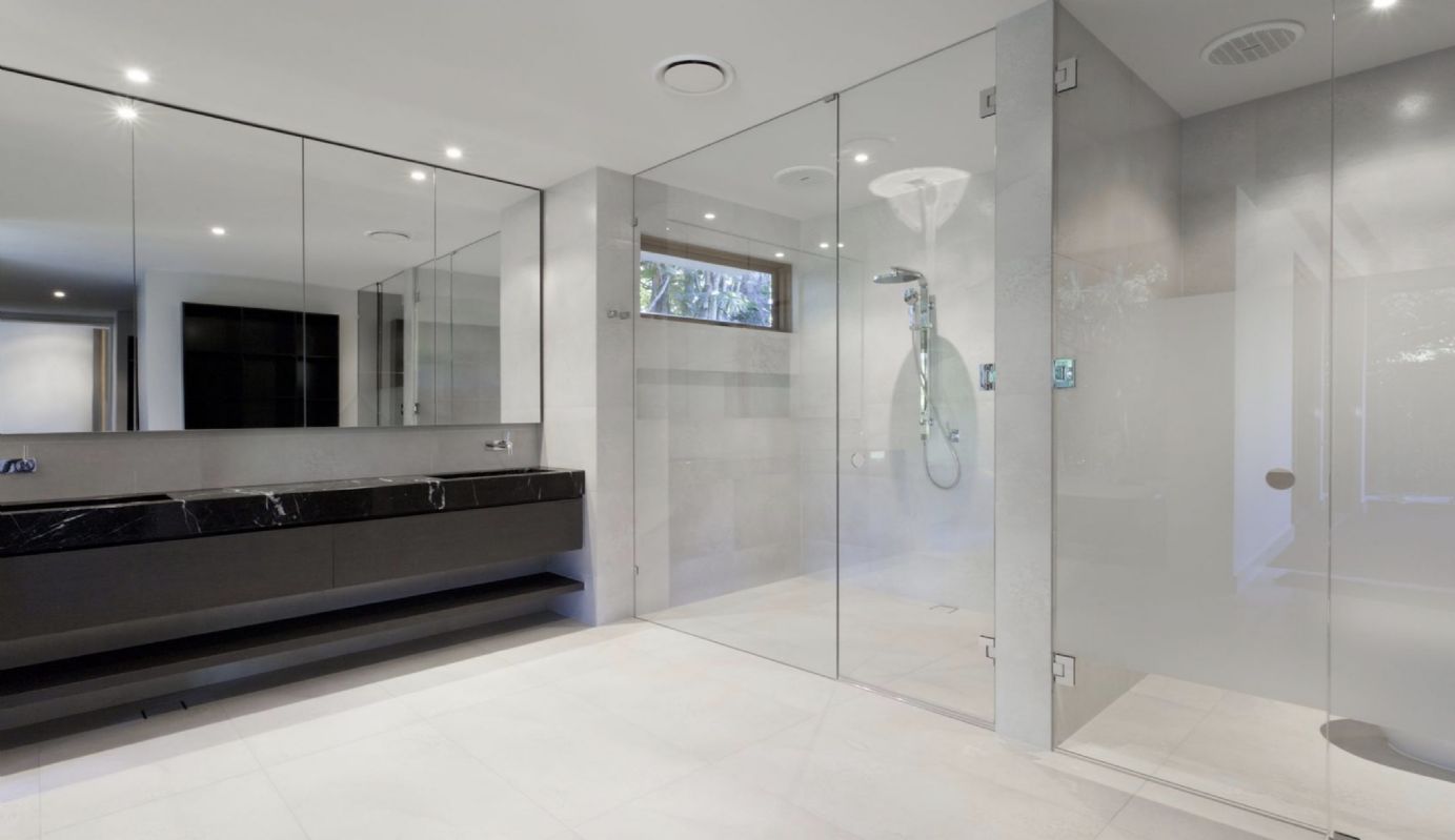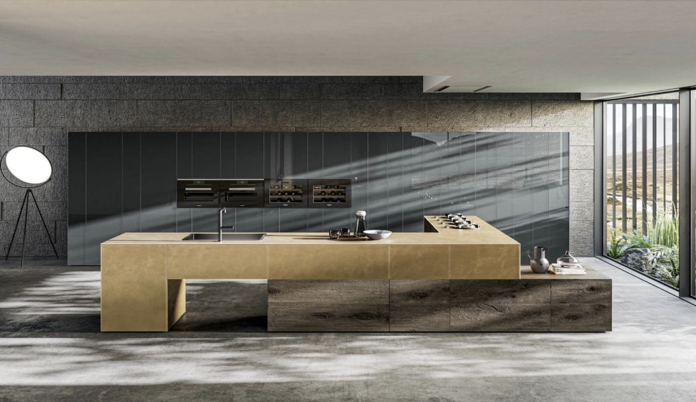 Binnen- en buitenvloeren en badkamer muren van SALONI, buitendraaiende deur van Porteline plafondhoog en 1,50 breed, onzichtbare binnendeuren plafondhoog en 1,00 m breed, apparaten van BOSCH.