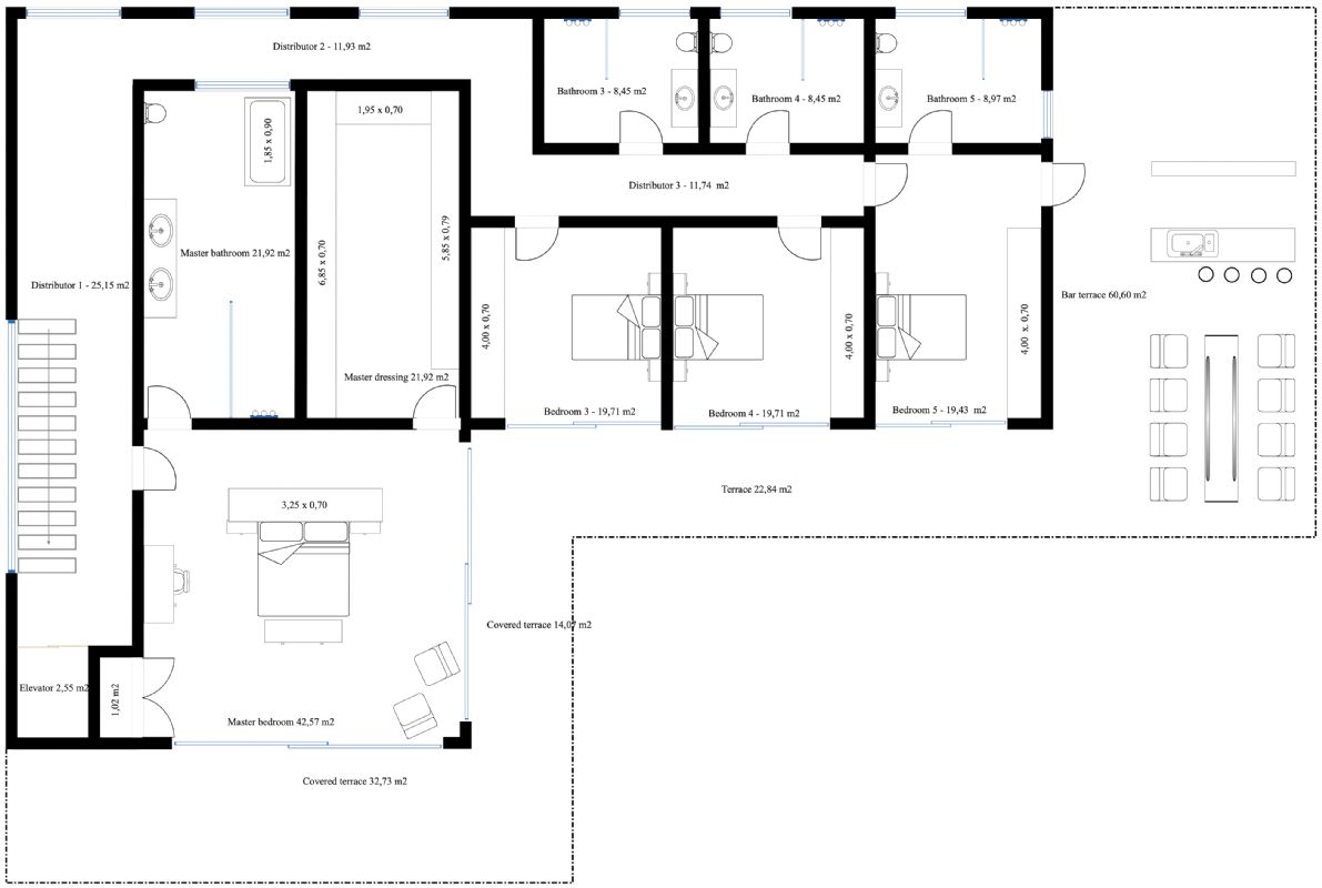 Op de eerste verdieping: lift, overloop, hoofdslaapkamer met hoofdbadkamer en grote kleedkamer en natuurlijk een enorm privéterras. Een gang leidt je naar nog eens 3 slaapkamers met 3 badkamers waarvan 1 ensuite en een terras dat toegankelijk is voor alle 3 de slaapkamers.