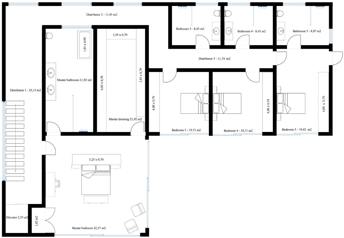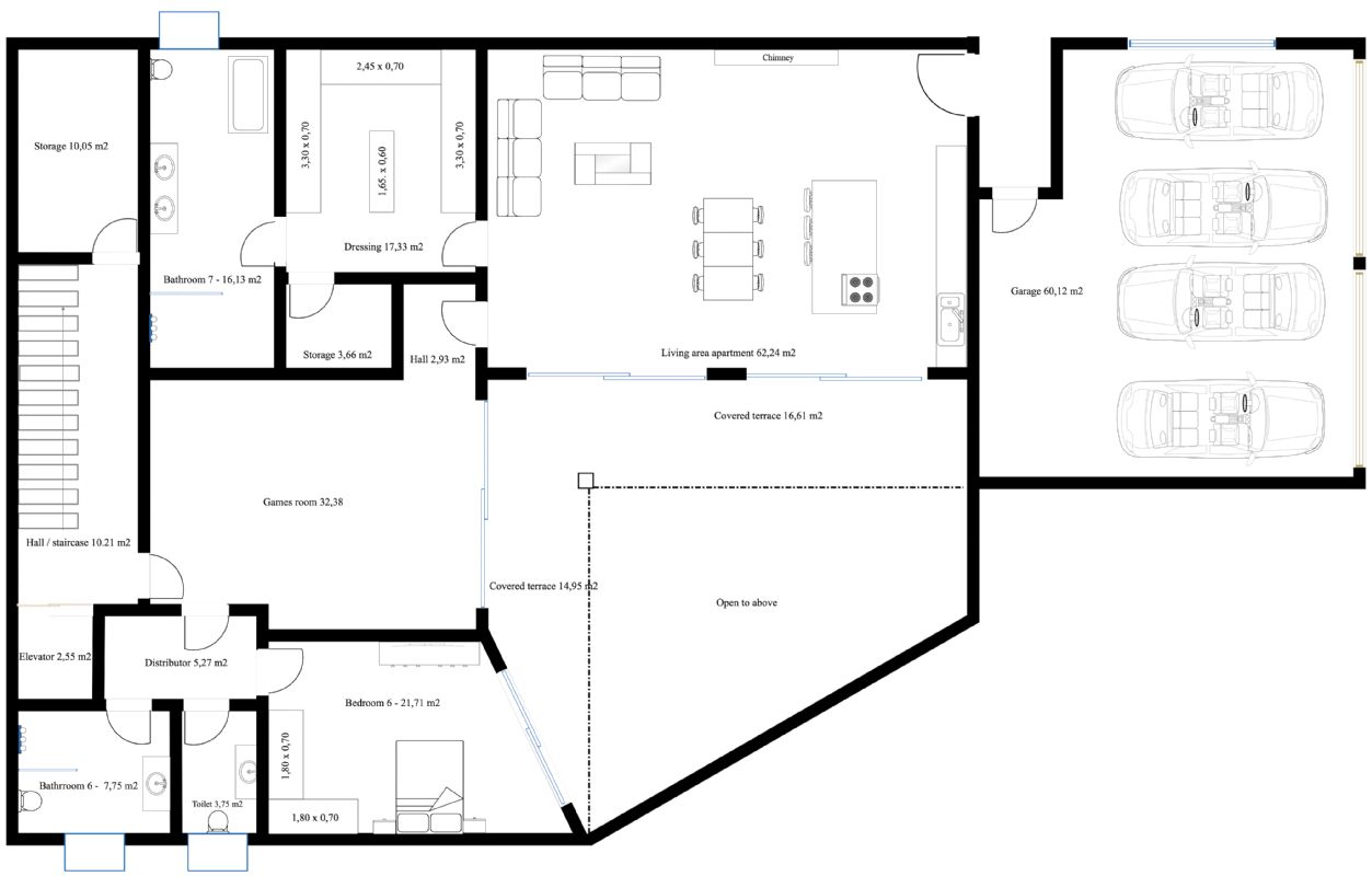 Verder brengt de lift je naar deze verdieping waar je nog een slaapkamer vindt met een badkamer ensuite, een apart appartement/slaapkamer en een speelkamer.