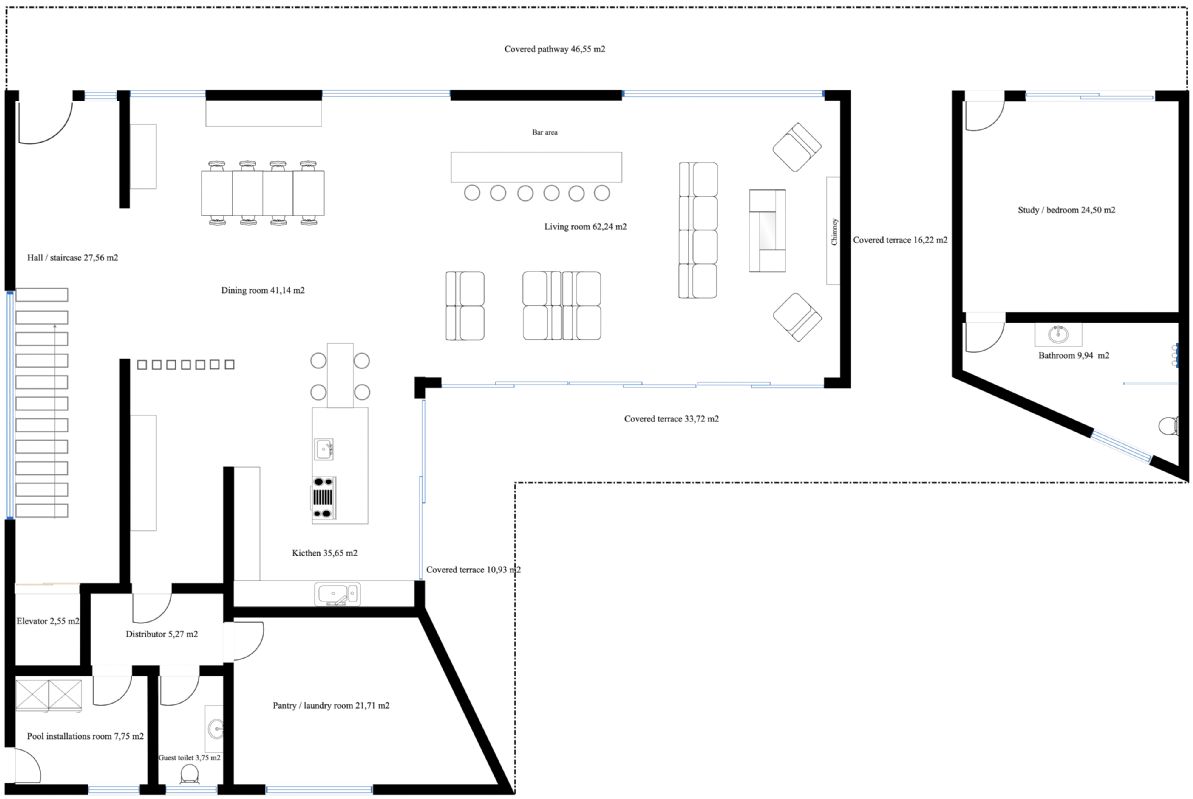 De begane grond: entree, hal met lift, gastentoilet, technische installatieruimte, ruime woon-/eetkamer met grote open volledig ingerichte keuken met Bosch apparatuur en aparte bijkeuken, verder is er op deze verdieping een aparte slaap-/werkkamer met en-suite badkamer, grote, overdekte terrassen met uitzicht op het grote verwarmde zwembad van 51,50 m2.
