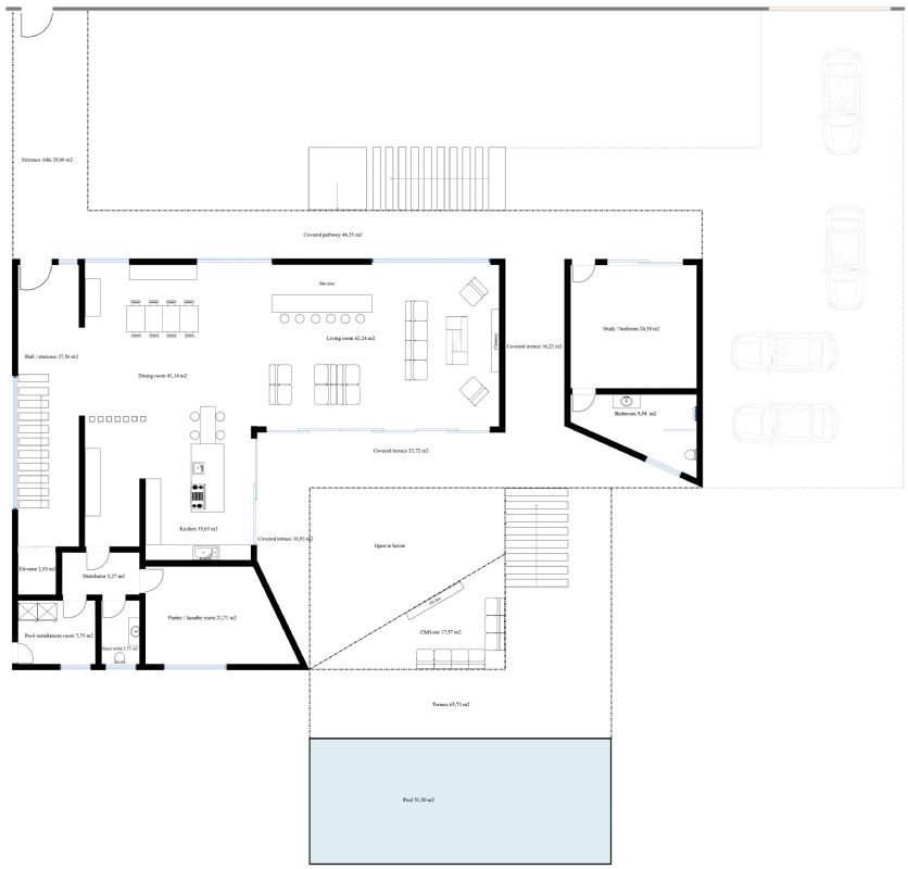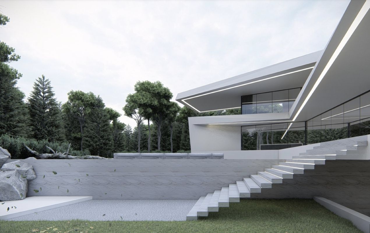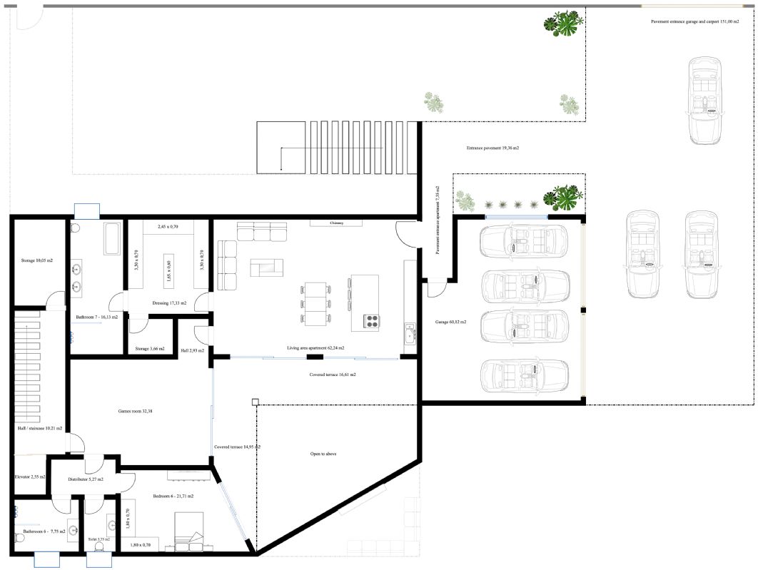 In de halve kelder heb je een enorme carport met een trap met een pad dat je naar de hoofdingang leidt.