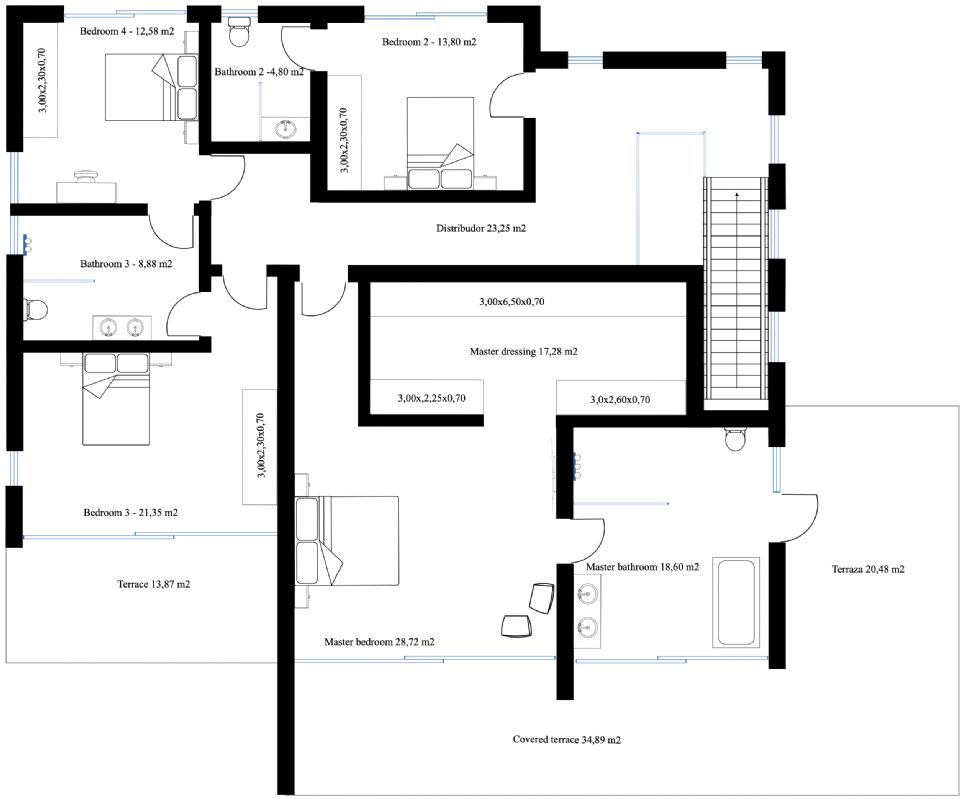 Eerste verdieping: overloop, 1 slaapkamer met badkamer ensuite, 2 slaapkamers die een badkamer delen en de hoofdslaapkamer met badkamer ensuite en kleedkamer, enorme terrassen