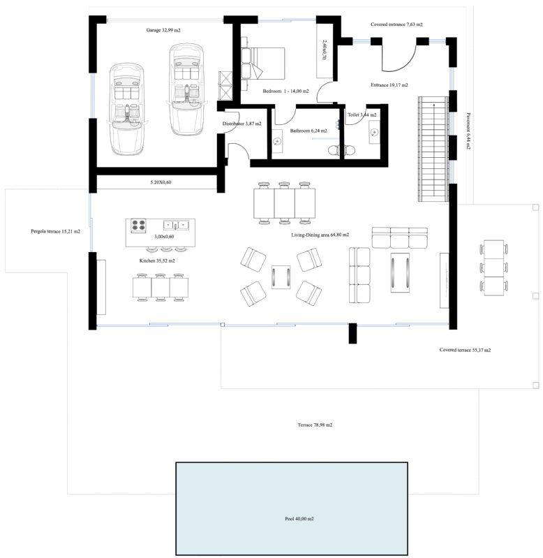 Deze woning zal worden gebouwd op 2 verdiepingen, de begane grond bestaat uit garage met de verdeler, een hal, woon / eetkamer, open keuken volledig uitgerust met Bosch apparatuur, 1 slaapkamer met een en-suite badkamer, grote terrassen, en het zwembad met chill-out