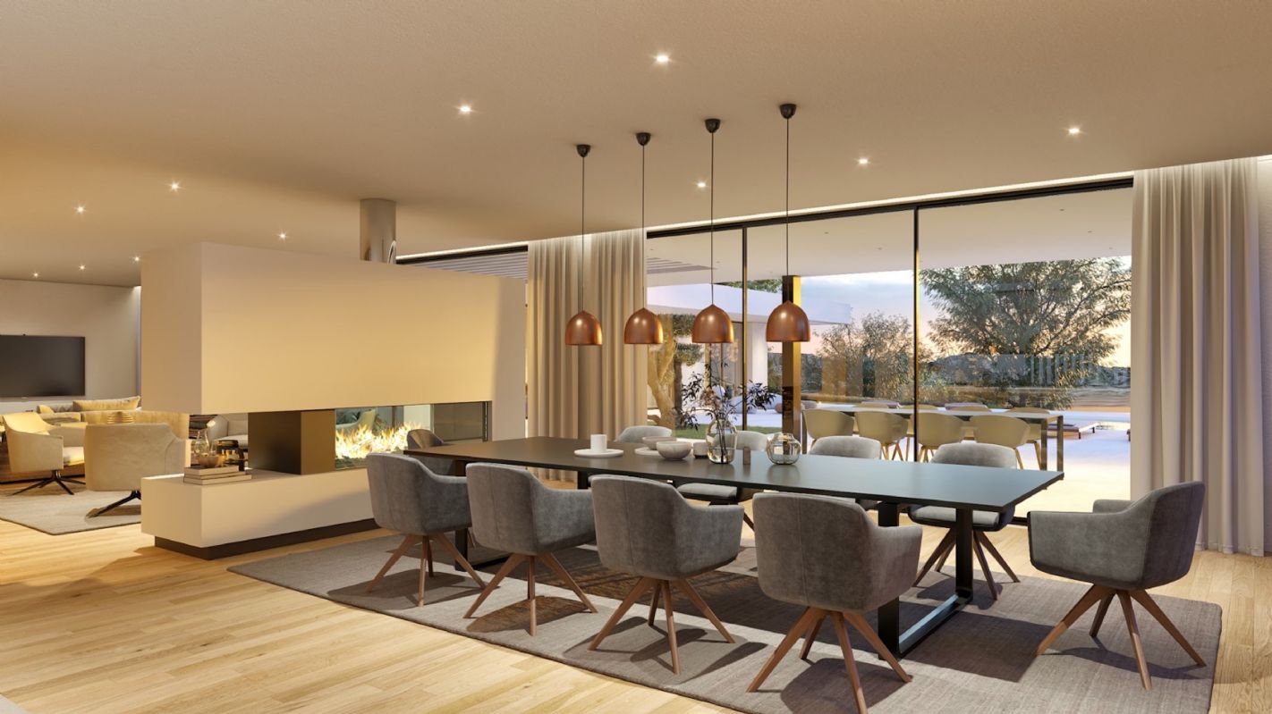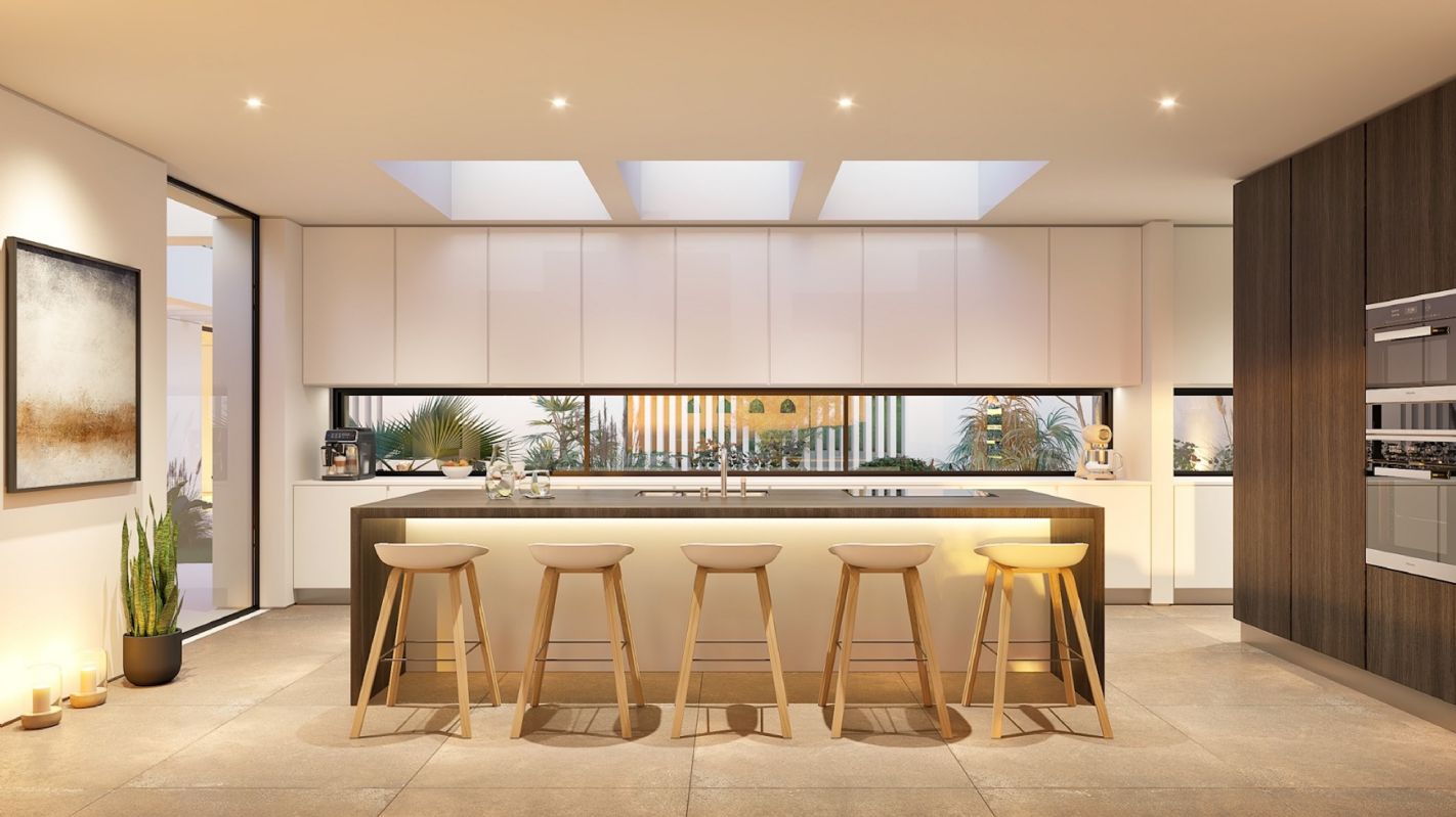 Entree, hal met garderobe, enorme woon / eetkamer gescheiden met keuken kasten maar nog steeds gedeeltelijk open. Via een verdeler ga je naar de hoofdslaapkamer met ensuite badkamer en dressing. In dit deel van de villa is ook nog een slaapkamer met badkamer ensuite.