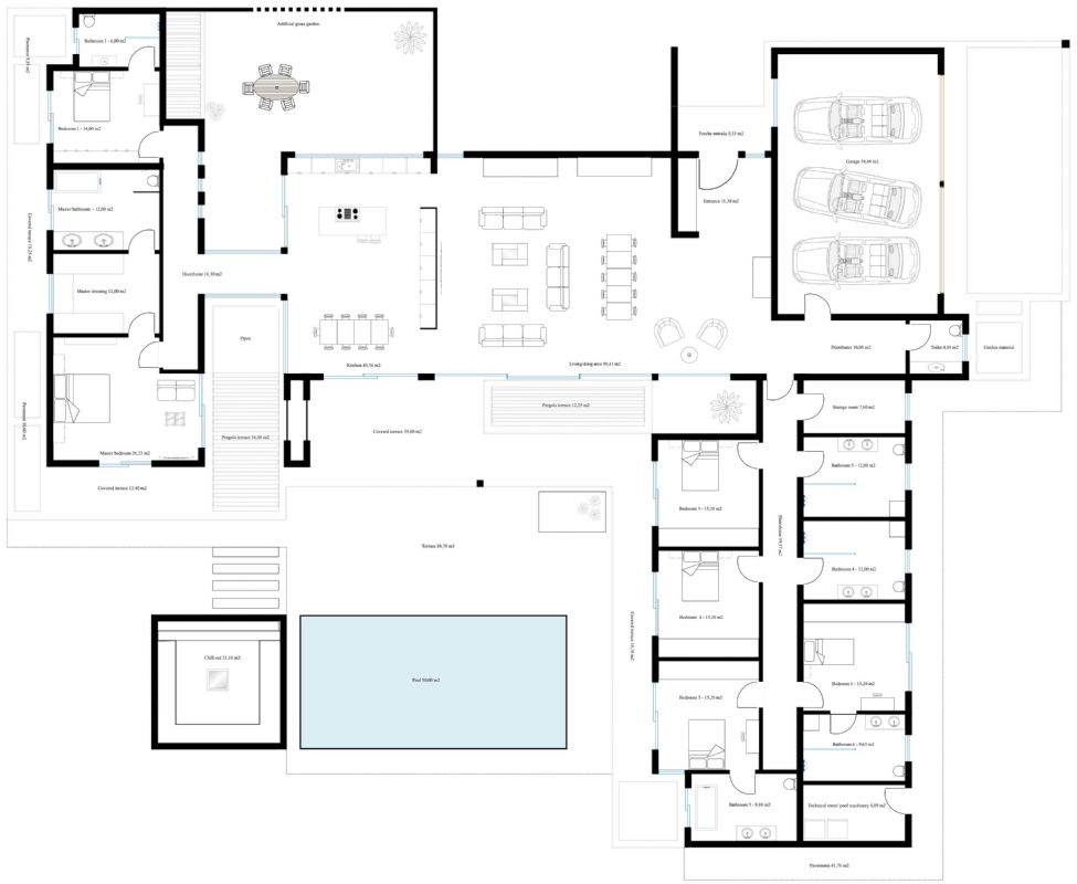 Verder zijn er verschillende overdekte terrassen, pergola terrassen en een terras met een chill-out, verwarmd zwembad en een open tuinberging.